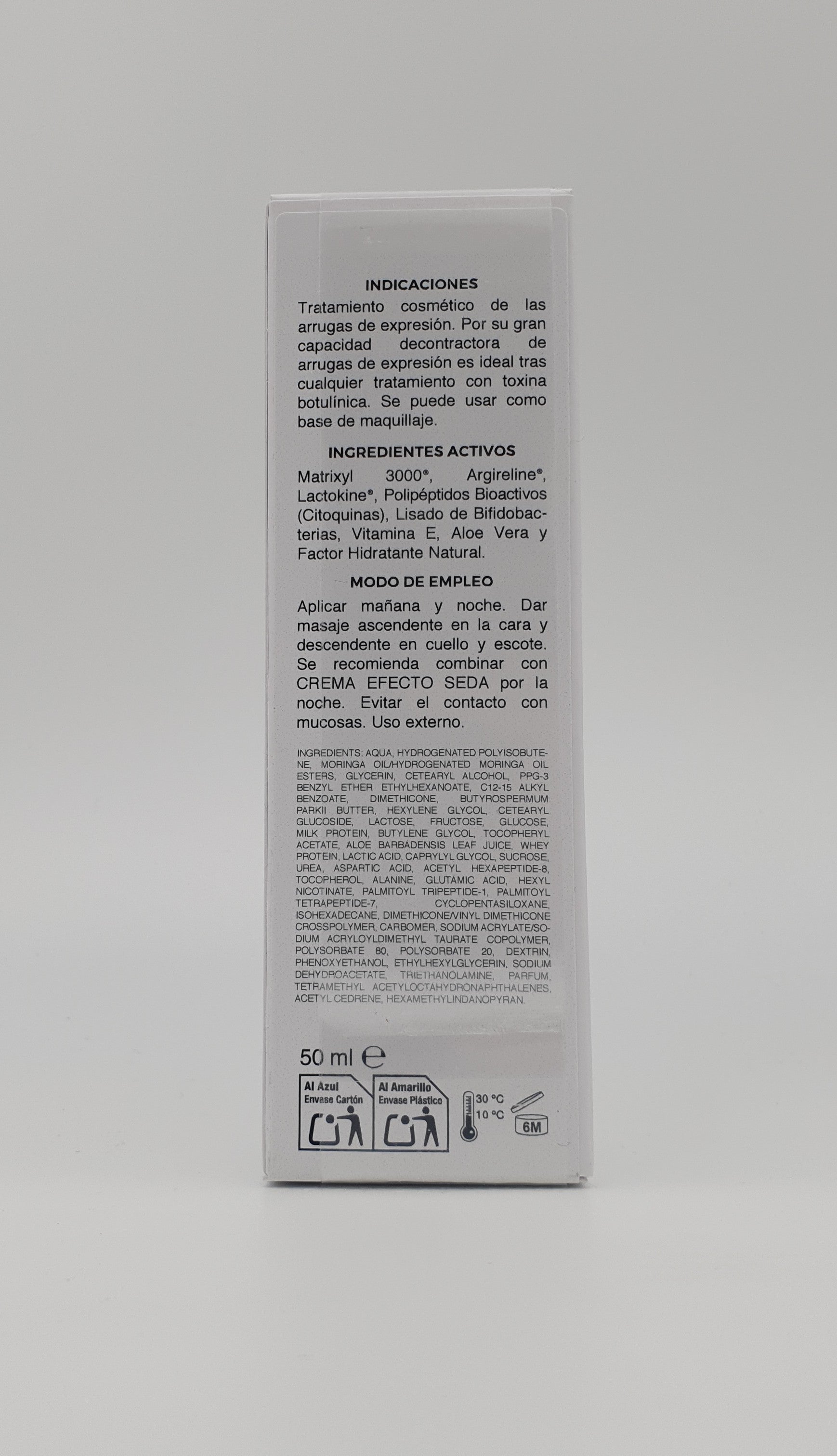 Anti-Wrinkle Expression Cream designed to soften and decongest expression lines. Its advanced formula with Matrixyl 3000®, Argireline®, and bioactive polypeptides works effectively to relax wrinkles, making it ideal for use after botulinum toxin treatments. Enriched with vitamin E, aloe vera, and natural moisturizing factors, it improves skin hydration and elasticity. Apply morning and evening with a gentle massage to the face, neck, and décolleté. It can be used as a makeup base and is recommended in combination with Silk Effect Cream to enhance nighttime results. For external use.