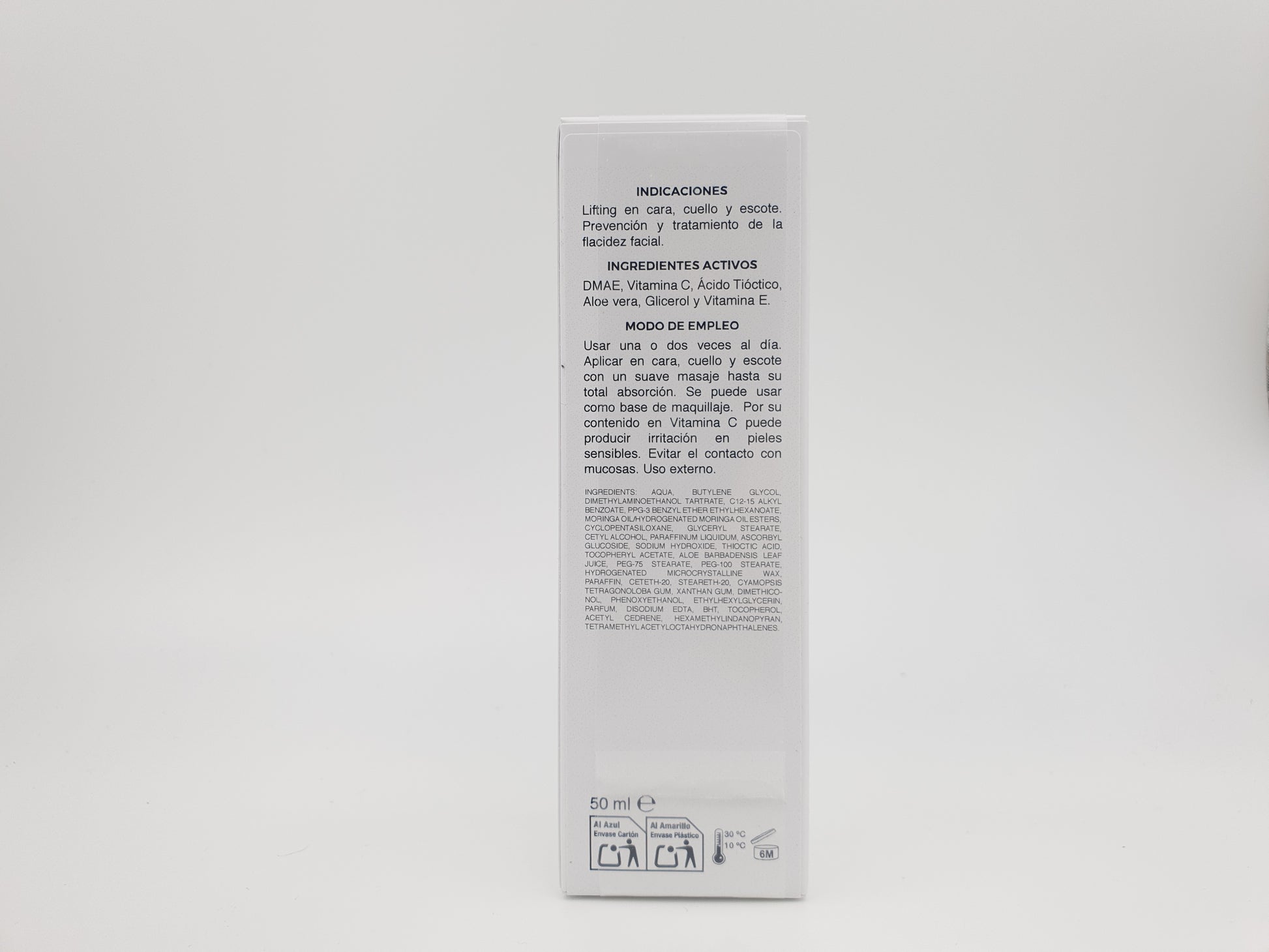 ACTIVE INGREDIENTS: DMAE, Vitamin C, Thioctic Acid, Aloe vera, Glycerol and Vitamin E.