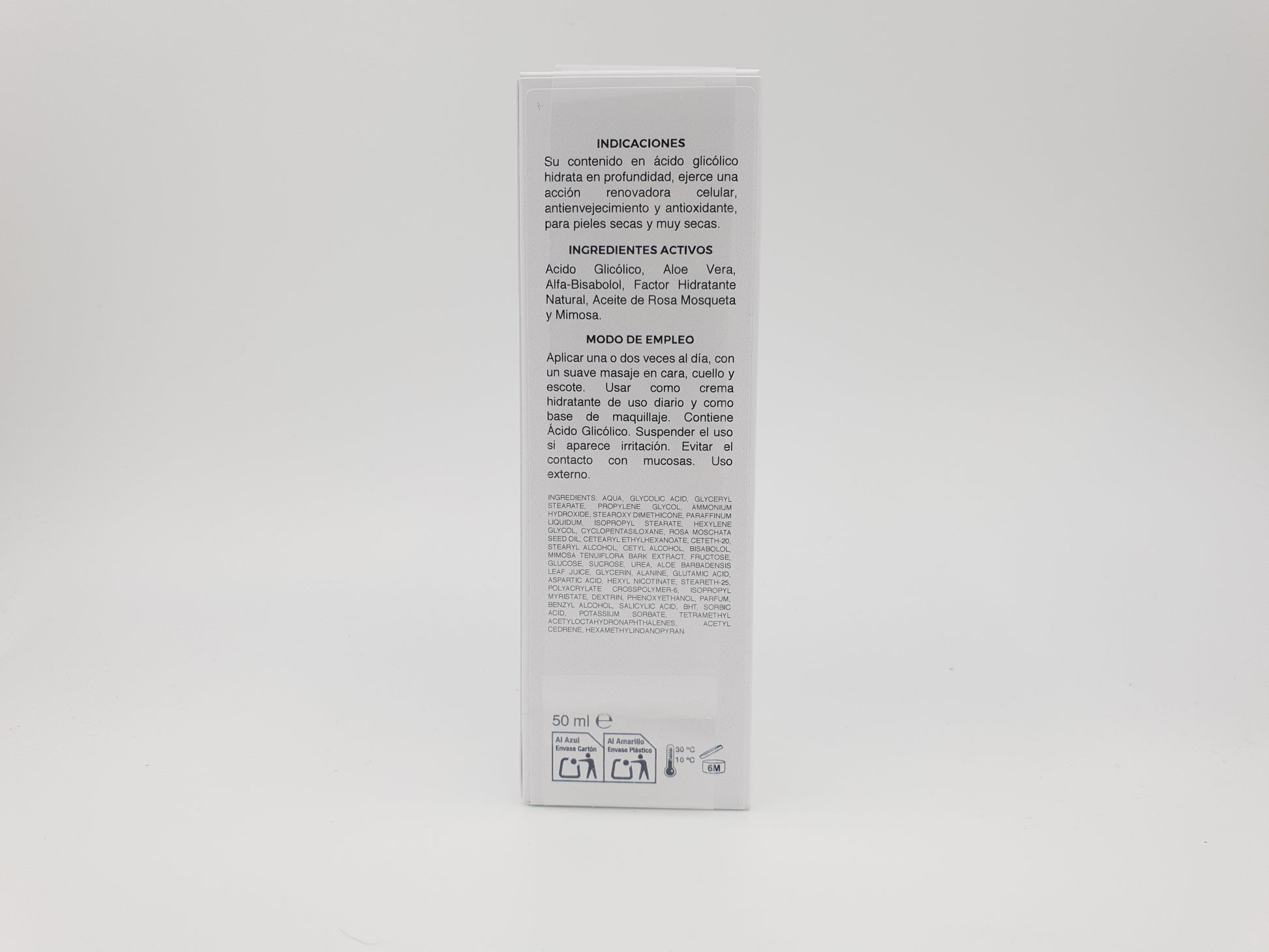 This facial cream with glycolic acid is formulated to deeply hydrate and renew dry and very dry skin. Its anti-aging and antioxidant properties improve skin texture, while ingredients such as aloe vera, rosehip oil, and alpha-bisabolol provide hydration and soothe. It is recommended to apply once or twice a day to the face, neck, and décolletage, using it as a daily moisturizer and to prepare the skin before applying makeup. Avoid contact with mucous membranes and discontinue use if irritation occurs. For external use.