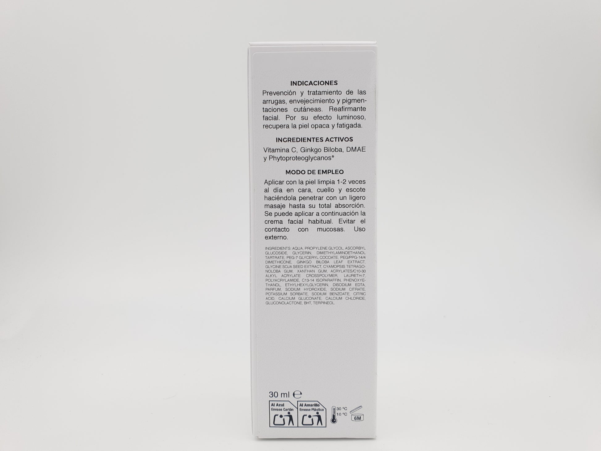 This serum with Vitamin C, Ginkgo Biloba, DMAE, and Phytoproteoglycans® is formulated to prevent and treat wrinkles, signs of aging, and skin pigmentation. Its firming and brightening effect revitalizes dull, tired skin, improving its firmness and appearance. Apply 1-2 times daily to a clean face, neck, and décolletage, massaging until fully absorbed. Ideal for incorporating into your daily facial routine, enhancing the effectiveness of your regular cream. For external use, avoiding contact with mucous membranes.